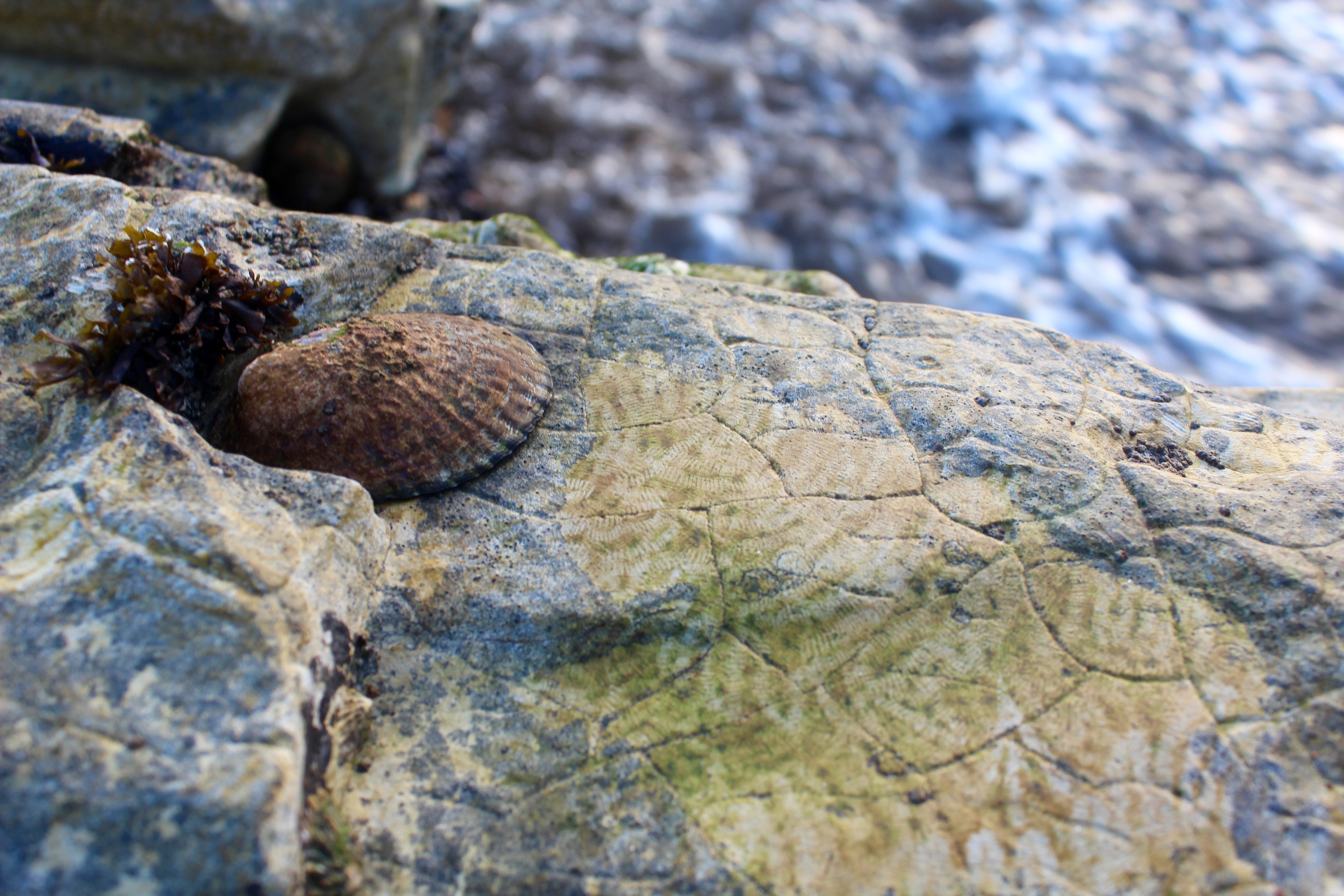 As I rub my inquisitive fingers along her serrated upper surface, I notice a green hue and slimy texture—a layer of algae, I deduce—growing upon the surrounding rock. The algal layer is arranged in a striking patchwork pattern, as if a miniature lawn mower had been haphazardly dragged across an overgrown, slippery lawn.