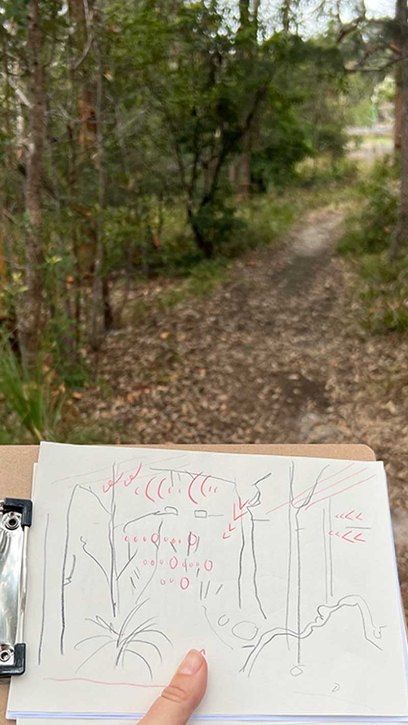 In this iteration, Dieter provided information and stories about local plant and animal species we observed, and Zoë led exercises developed for this location from the Urban Field Naturalist book, to ground participants in place and sketch observations of what we could see, hear, smell and feel (no tasting!) A few of the exercises are below: