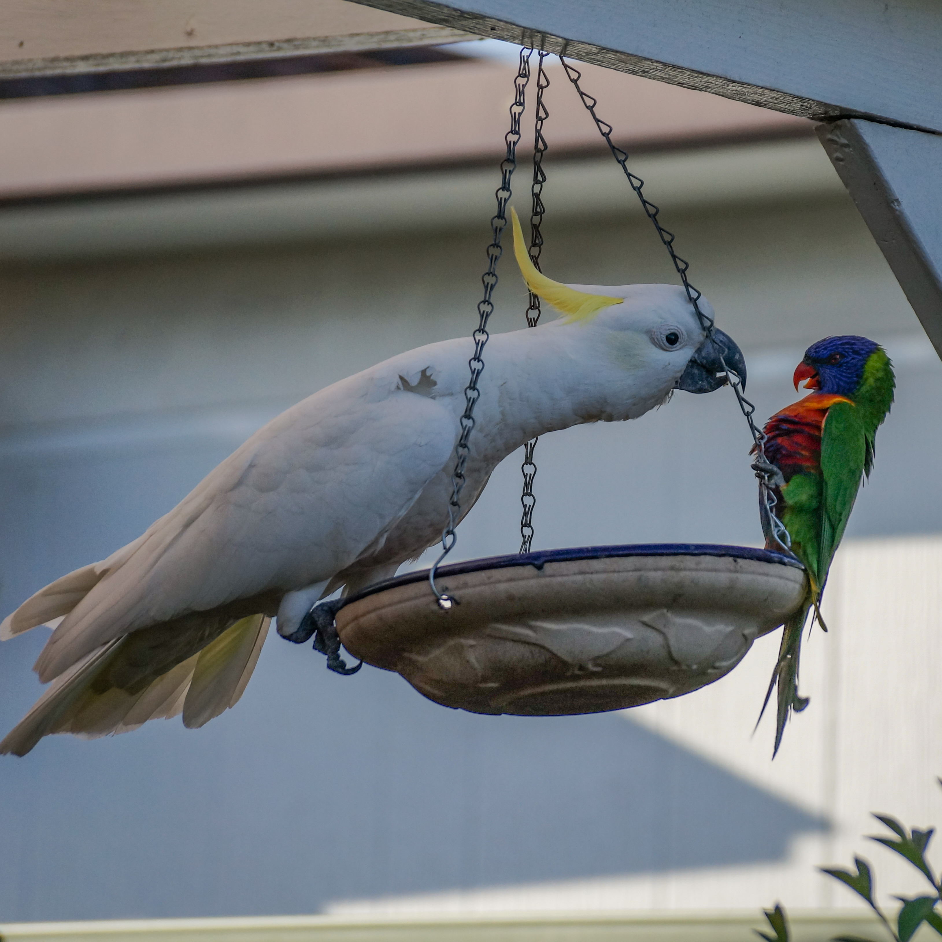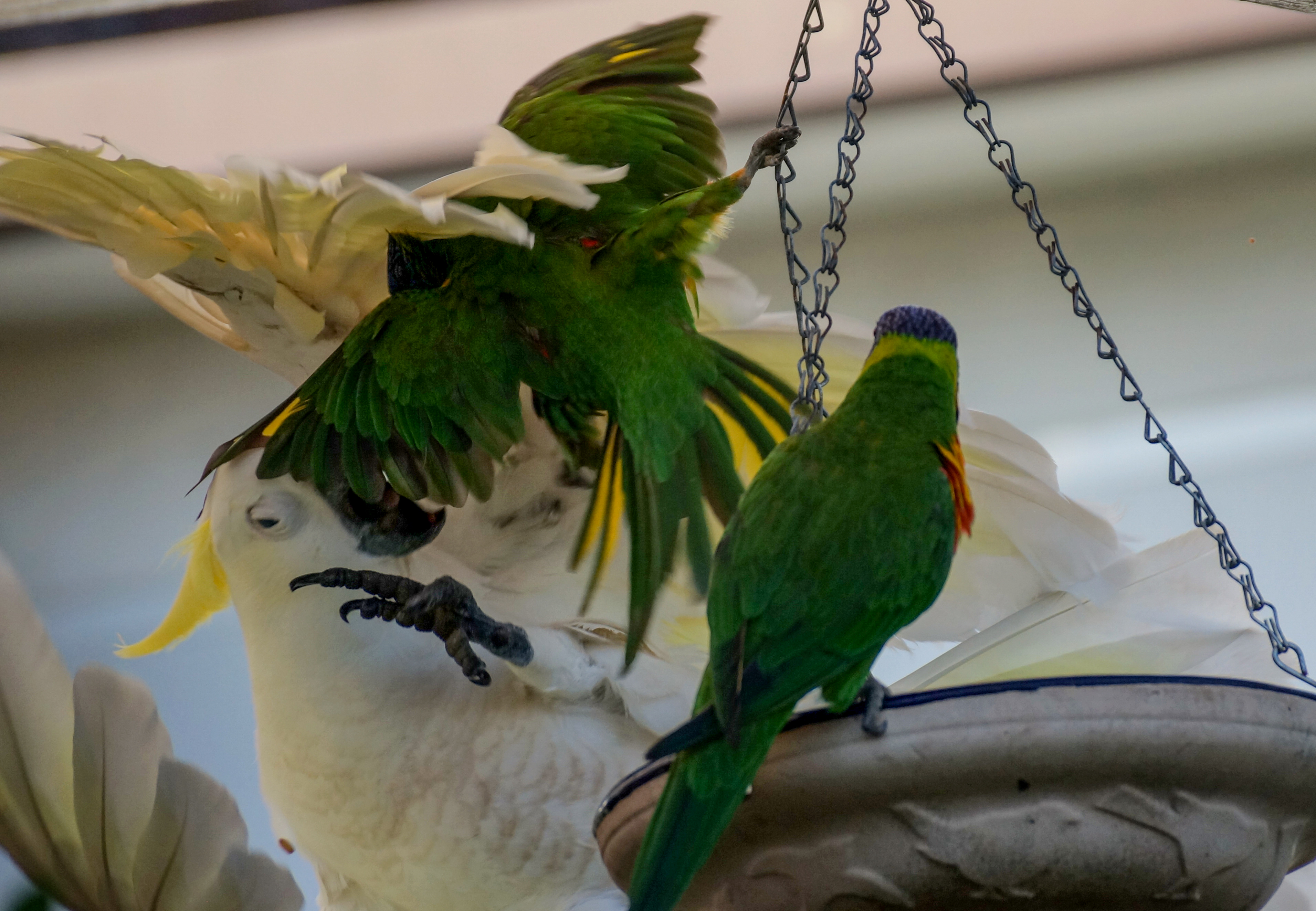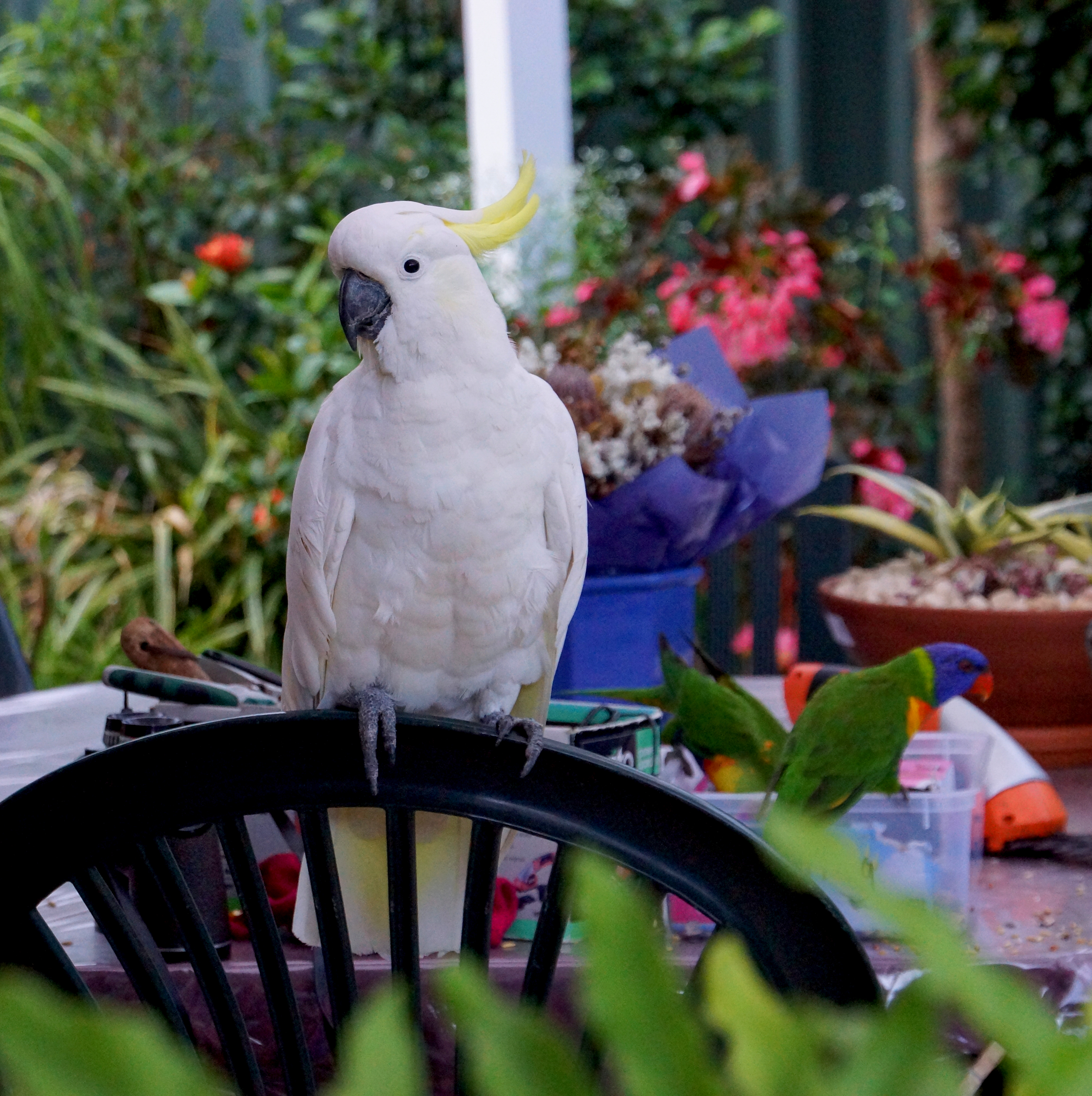 Some months later I had to stop providing seeds for the birds. One day, when the cockatoo was at the feeder, the lorikeets came in to the feeder too. But this time, the cockatoo stood up to the lorikeets and things quickly became very nasty. The lorikeets soon flew away and once the cockatoo had finished, I took the feeder down. What had once been a lovely social interaction between birds had become a violent attack involving all three. Not a nice thing to happen.