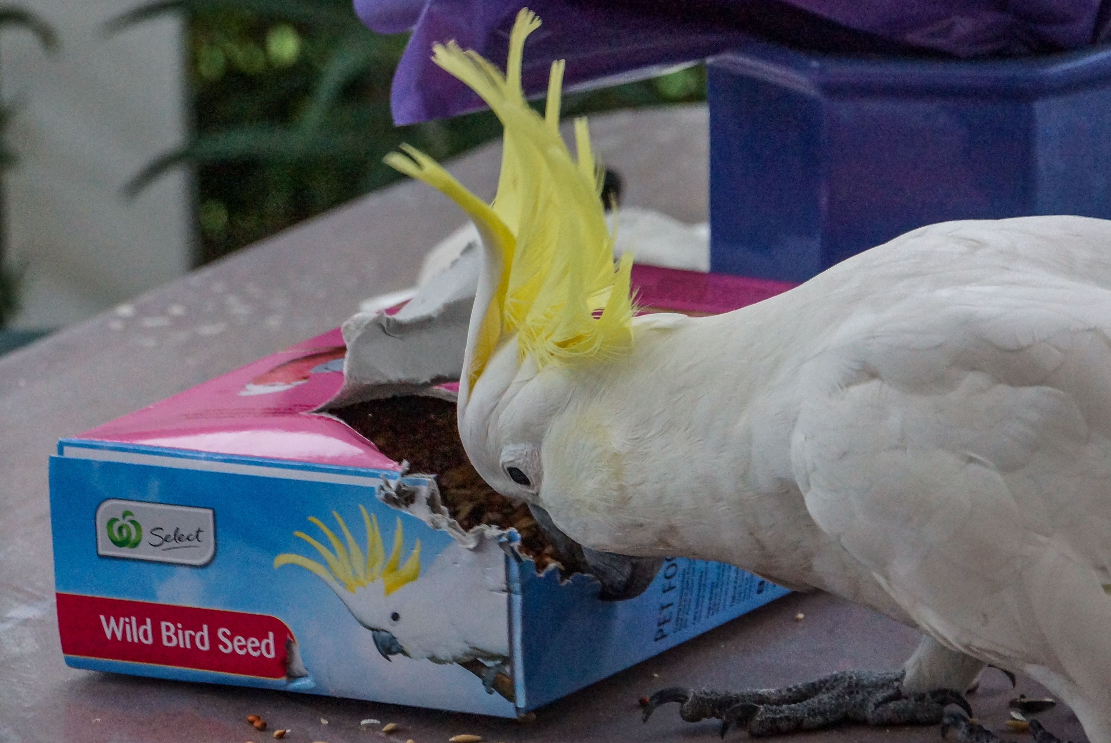 Noticing a pair of King-Parrots resting under my pergola, I put out a seed bell for them. I soon realised that a regular pair of visiting Rainbow Lorikeets (Squawky and his Missus) had also discovered the feast. Not good for them! Then a Sulphur-crested Cockatoo also discovered the seed bell. I suspect the lorikeets and cockatoo chased the King-Parrots away. I decided to put the seed bell out after the lorikeets had left my garden for the cockatoo. The seed bell soon got eaten, but all I could get was loose seed. I left the packet on the table, ready for filling the feeder the next time the cockatoo visited.