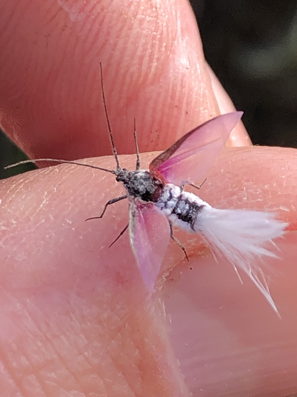 Perplexed, I reached up and attempted to catch one of the dozen or more that floated around me, but it changed direction. I held up my hand in the vicinity of one of these tiny floating feathers and as it landed I could see wings and legs. It appeared almost fairy-like with beautiful translucent purple wings and a tuft of vivid white hair extending from its abdomen. A waxy resin was along the sides of its abdomen, which I mistook for modified gills thinking it had just emerged from a nymph stage in the water.